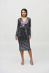 This stylish Joseph Ribkoff dress is made of a solid-color sequined knit fabric with a shirred waist detail. It also features a v-neckline, long sleeves, and a knee-length hem.