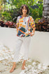 This linen/tencel blend colourful abstract top features cuff sleeves and a rounded neckline.